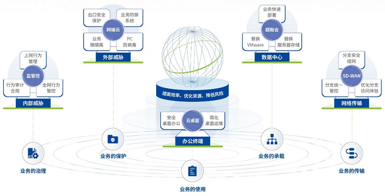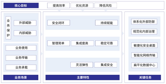 數(shù)字化轉(zhuǎn)型的核心目標(biāo)是“提高效率、優(yōu)化資源、降低風(fēng)險”,業(yè)務(wù)場景包含“業(yè)務(wù)保護、業(yè)務(wù)使用、業(yè)務(wù)傳輸、業(yè)務(wù)承載”,將核心目標(biāo)與業(yè)務(wù)場景相結(jié)合,可明確數(shù)字化轉(zhuǎn)型關(guān)鍵任務(wù)為“體系化外部防御、規(guī)范化內(nèi)部治理、敏捷化安全桌面、智能化網(wǎng)絡(luò)傳輸、扁平化數(shù)據(jù)中心”。企業(yè)可進一步結(jié)合自身的發(fā)展情況,從最為緊迫的關(guān)鍵任務(wù)入手,一步步走好轉(zhuǎn)型之路。