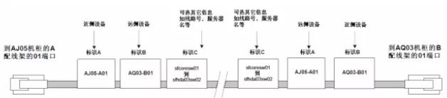 例如,連接到圖4.7.4-3所示配線架第一個位置的線纜可能包含如下標簽:AJ05-A01/AQ03-B01。 AQ03 機柜中的同一根電纜將包含以下標簽:AQ03-B01/AJ05-A01。如圖6 如圖。