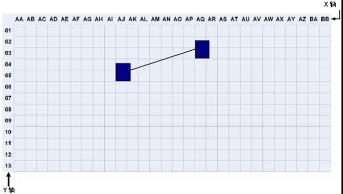 在數據中心,機柜和機架的位置和布局可以根據活動地板的劃分進行組織和標記。根據ANSI/TIA/EIA-606-A標準,數據室應使用兩個或兩個字母,每個600mm*600mm活動地板用阿拉伯數字標識。在數據中心機房平面圖上建立X、Y坐標系的網格,用字母標記X軸,用數字標記Y軸,建立坐標原點。機架和機柜的位置基于它們在網格地圖上的正面坐標。標注如下圖 2所示